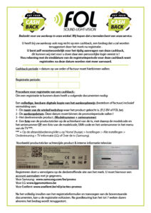 In bijgevoegd bestand vindt u de nodige informatie om een cashback aan te vragen bij onze leveranciers. U dient deze zelf aan te vragen, want hiervoor is een persoonlijke login/account nodig op hun website. Voorzie een foto van het modelnummer en serienummer van je toestel en van het aankoopbewijs of factuur.
