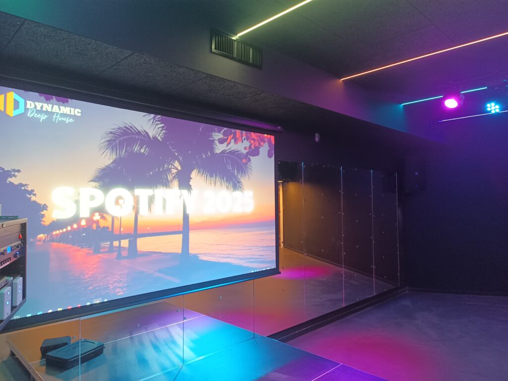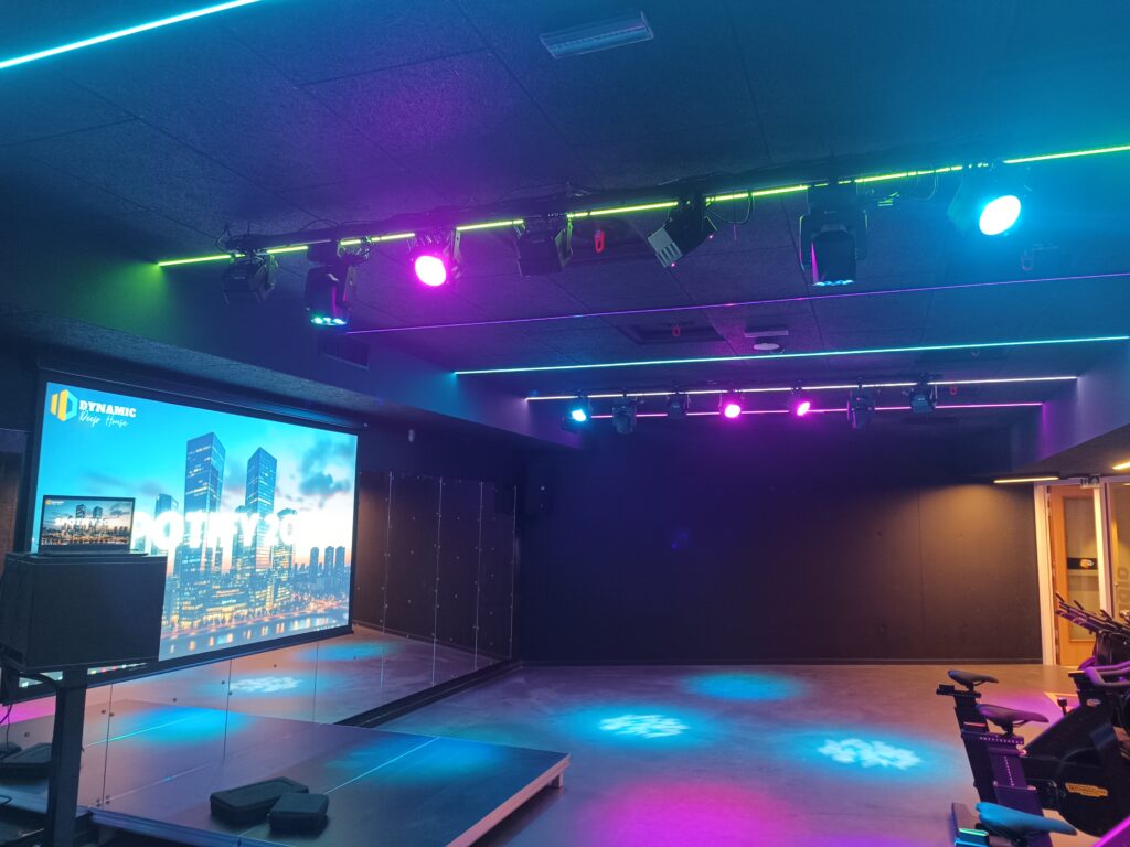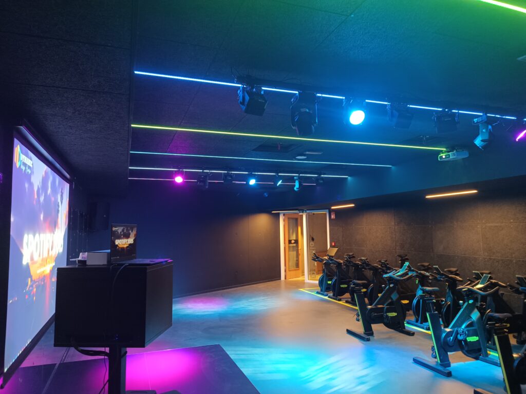 In de spinningruimte te Kortrijk kozen we voor ledstrips aan het plafond om verschillende sferen te creëren. Deze verlichting draagt bij aan een toffere sportbeleving in combinatie met onze opgehangen luidsprekers en een fitness headset voor de lesgever.